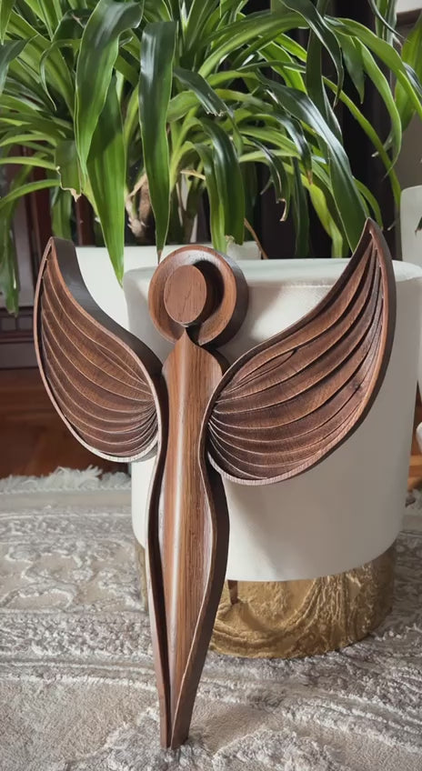 This elegant angel sculpture, handcrafted from solid oak wood, combines simplicity with spirituality, making it an ideal piece for modern interiors. The design reflects a guardian angel in a sleek, contemporary form, perfect for adding a touch of peace and serenity to your living space.