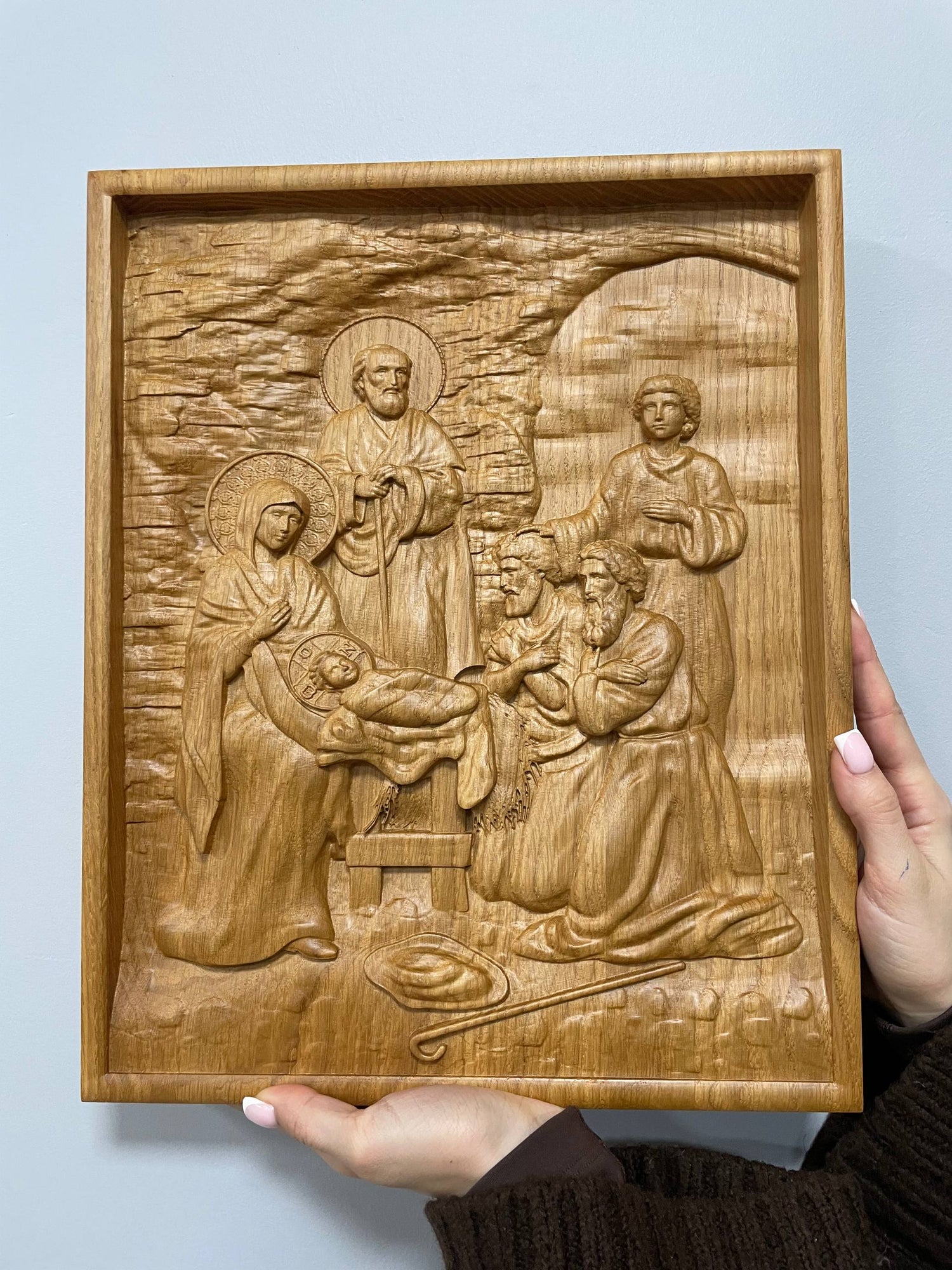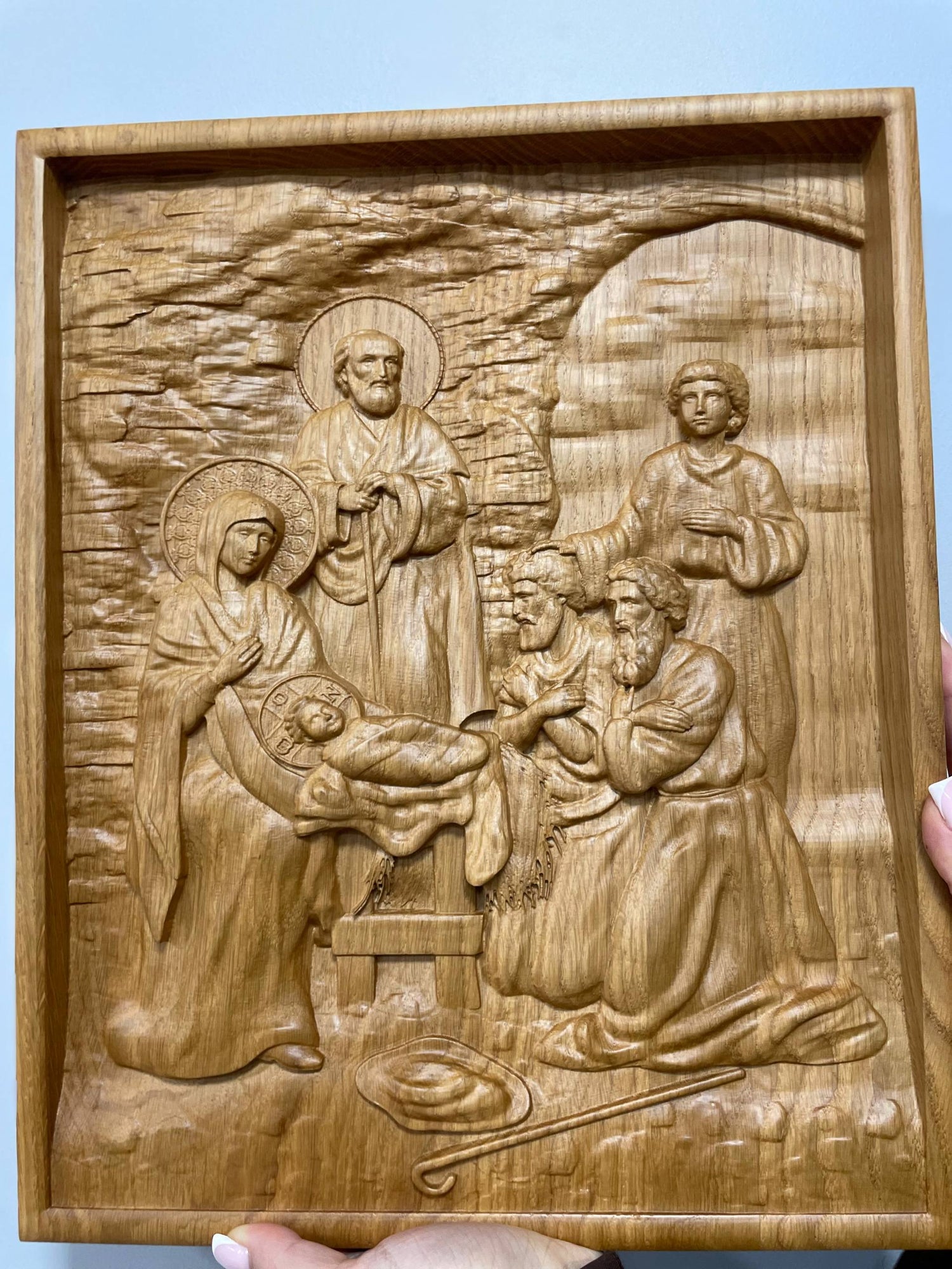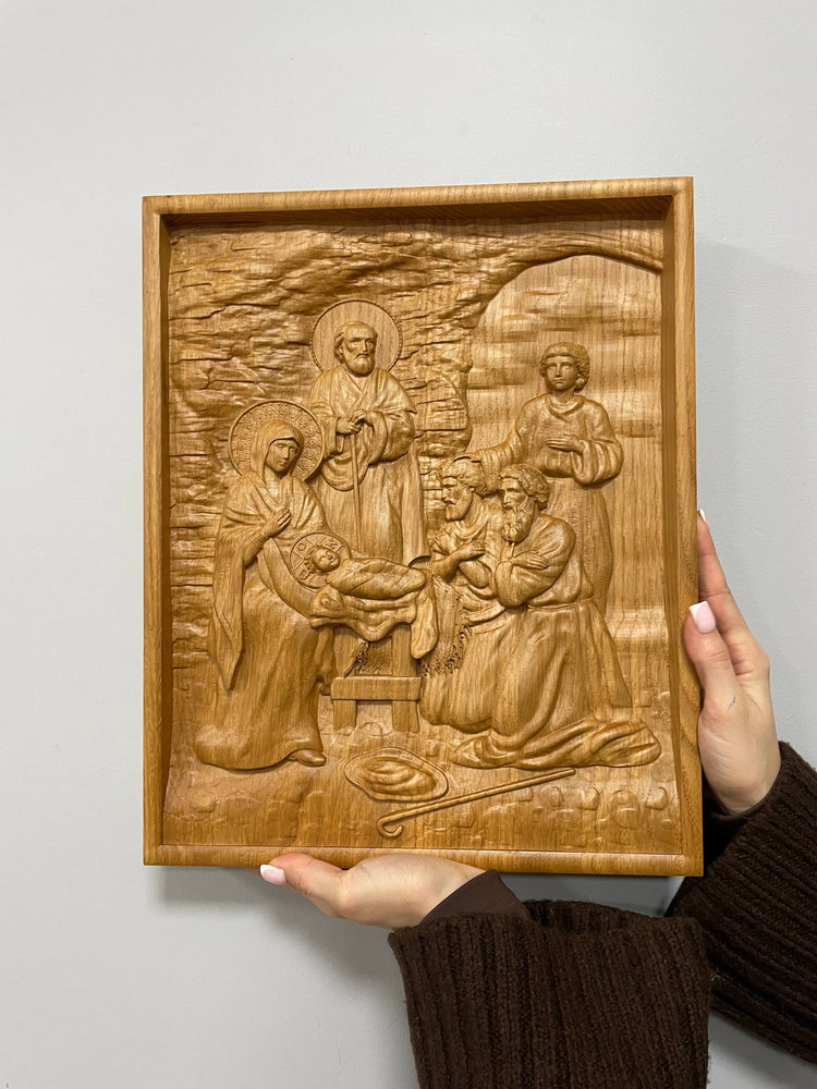 The Holy Family is one of the most popular subjects in Christian art, and this beautiful wooden carved image is a perfect example. The image depicts Mary, Joseph, and the baby Jesus, surrounded by angels. It makes a lovely wall art piece or a thoughtful Christmas gift for someone special. The sculpture can be personalised with an engraving of your choice, making it an extra special gift. The holy family picture is available in five different colors and all sizes.