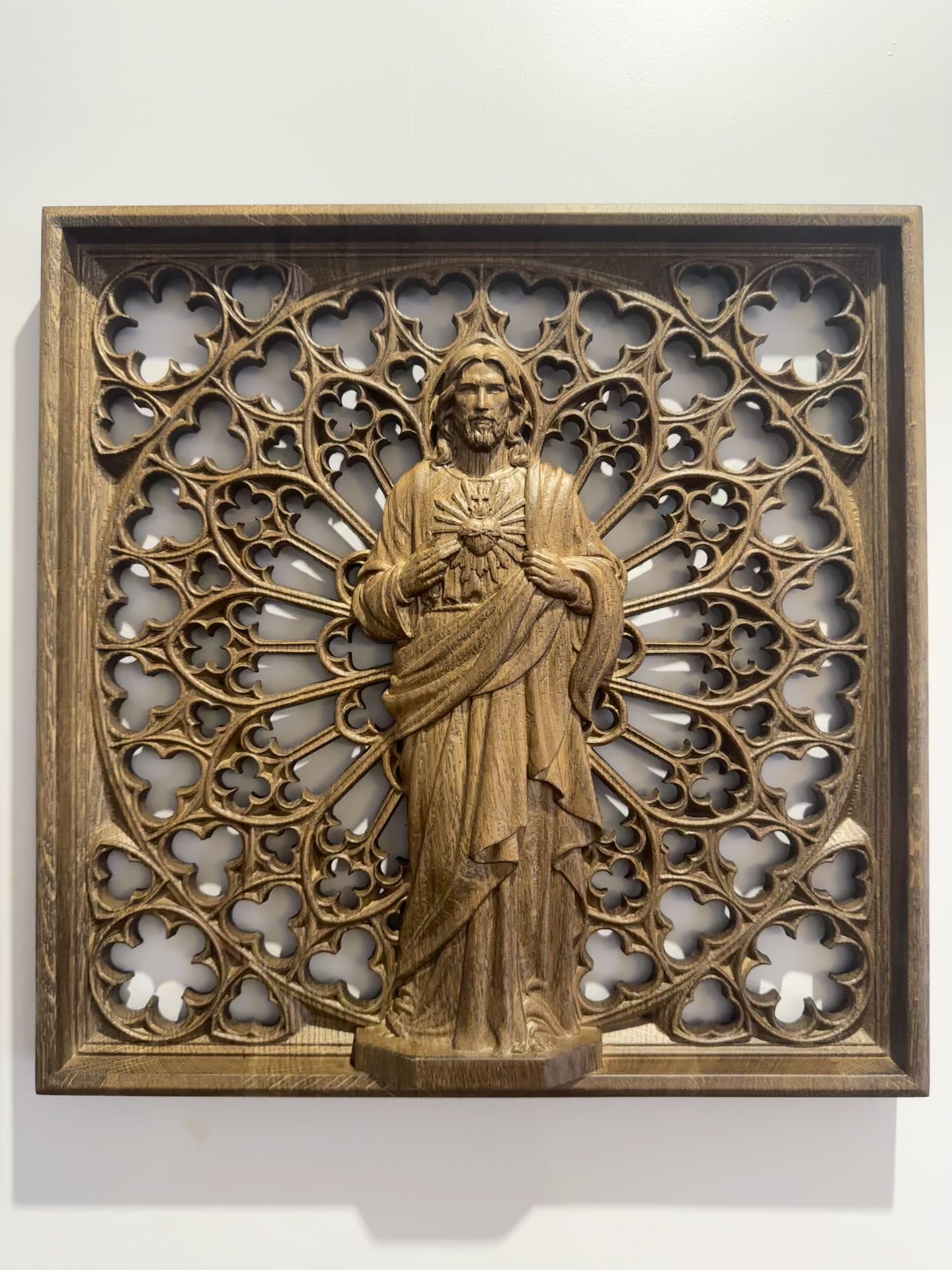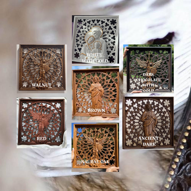 This wooden wall statue is beautifully handcrafted religious wood carving that serves as a remarkable piece of Christian home decor. This is a stunning piece of Catholic wall art that adds a touch of spirituality and elegance to your home decor. It is made in gothic design to emphasize the beauty of details on the background with your wall.