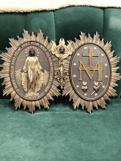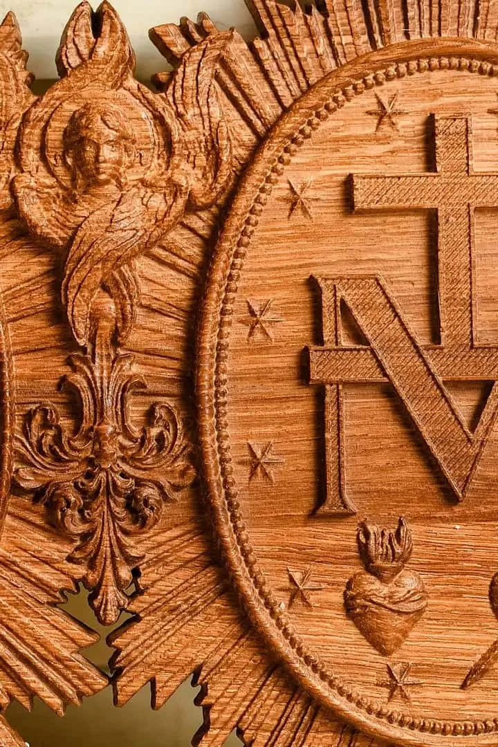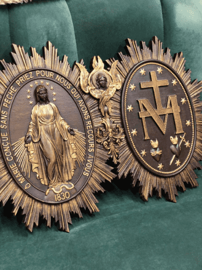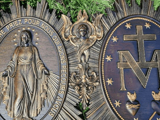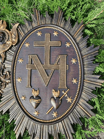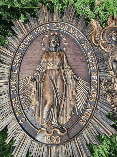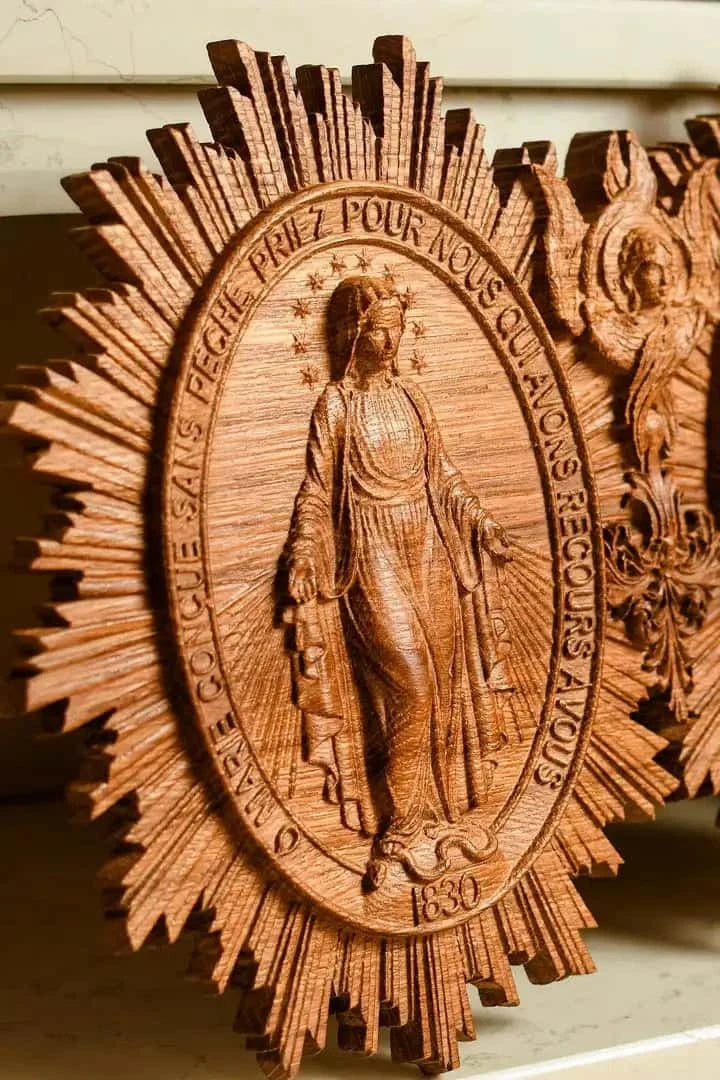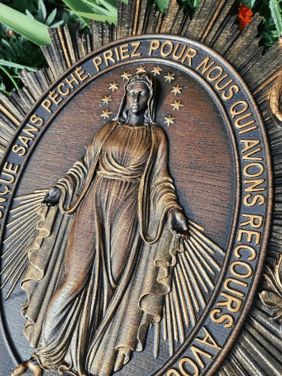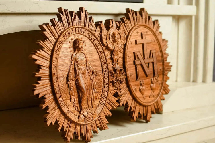 The Christian Miraculous Medal of the Immaculate Conception is a beautiful wall hanging wooden plaque that features the Virgin Mary of Grace. According to Catholic Church teachings, the use of sacramentals like this medal helps prepare people to receive God's grace and makes them more likely to cooperate with it. This lovely piece makes a great addition to any Christian home, and would make a wonderful gift for anyone who is interested in deepening their faith.