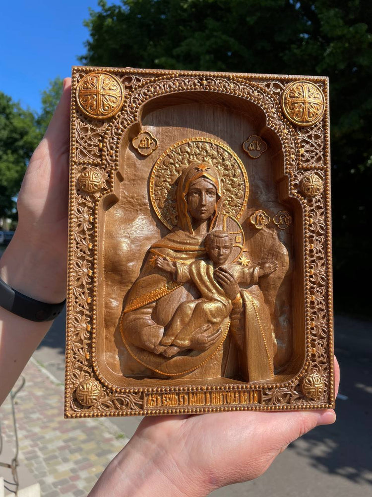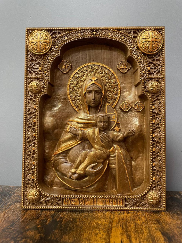 This sacred Leushino Icon of the Mother of God is masterfully hand-carved in wood, showcasing traditional Orthodox craftsmanship and deep spiritual meaning. Ideal for home altars, prayer spaces, or as a heartfelt religious gift, this wooden wall art brings peace and beauty into any Christian home.