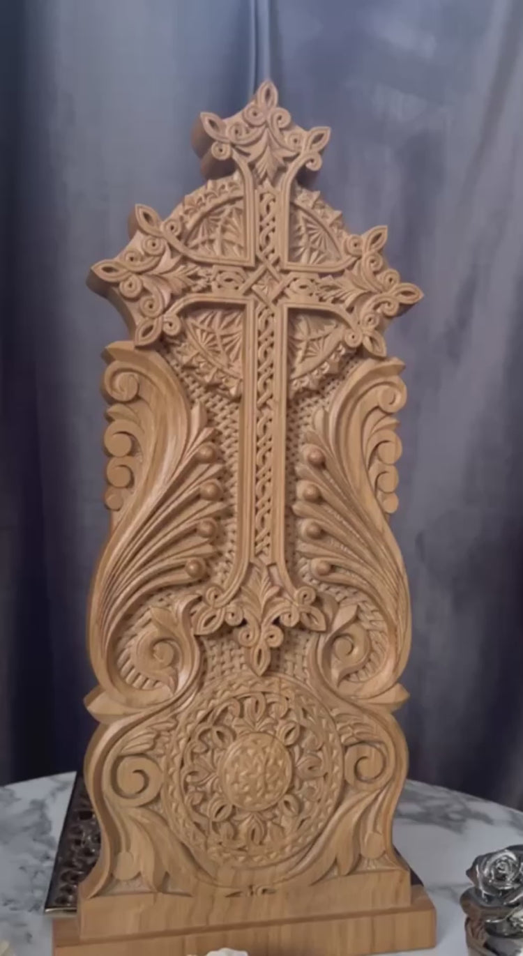 This Image is made from the high quality natural solid Oak wood. Its finest details and its sizing involve computer processing technology with manual tuning and the final details are finished by hand and painted with gold color.