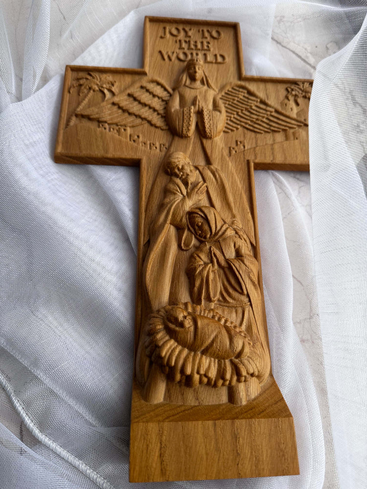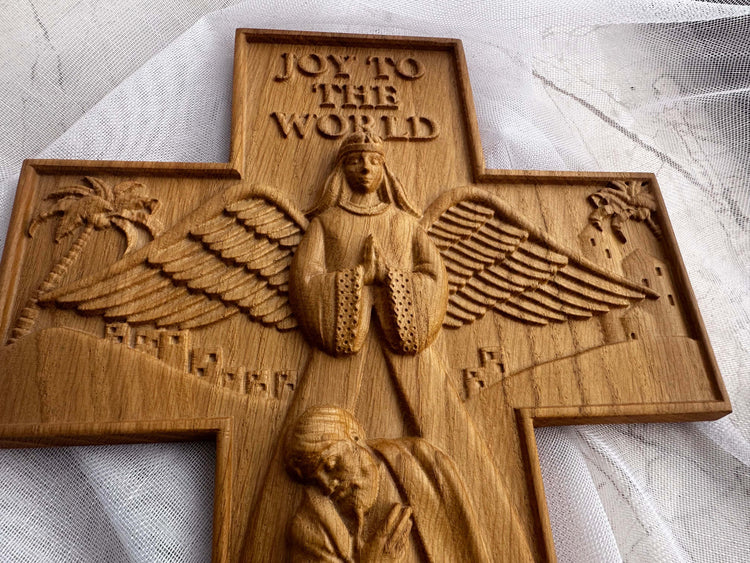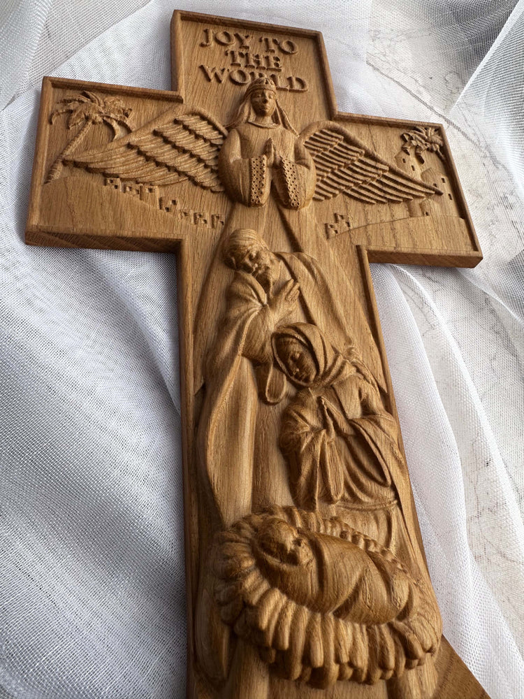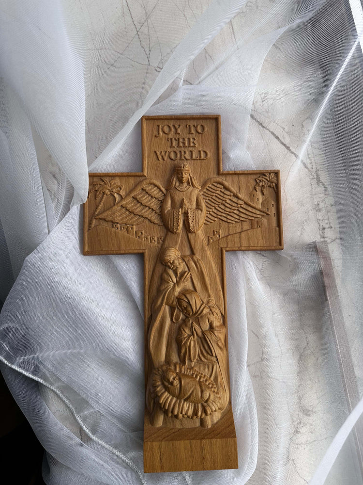 The Holy Family is one of the most popular subjects in Christian art, and this beautiful wooden carved image is a perfect example. The image depicts Mary, Joseph, and the baby Jesus, surrounded by angels. It makes a lovely wall art piece or a thoughtful Christmas gift for someone special. The sculpture can be personalised with an engraving of your choice, making it an extra special gift. The holy family picture is available in five different colors and all sizes.