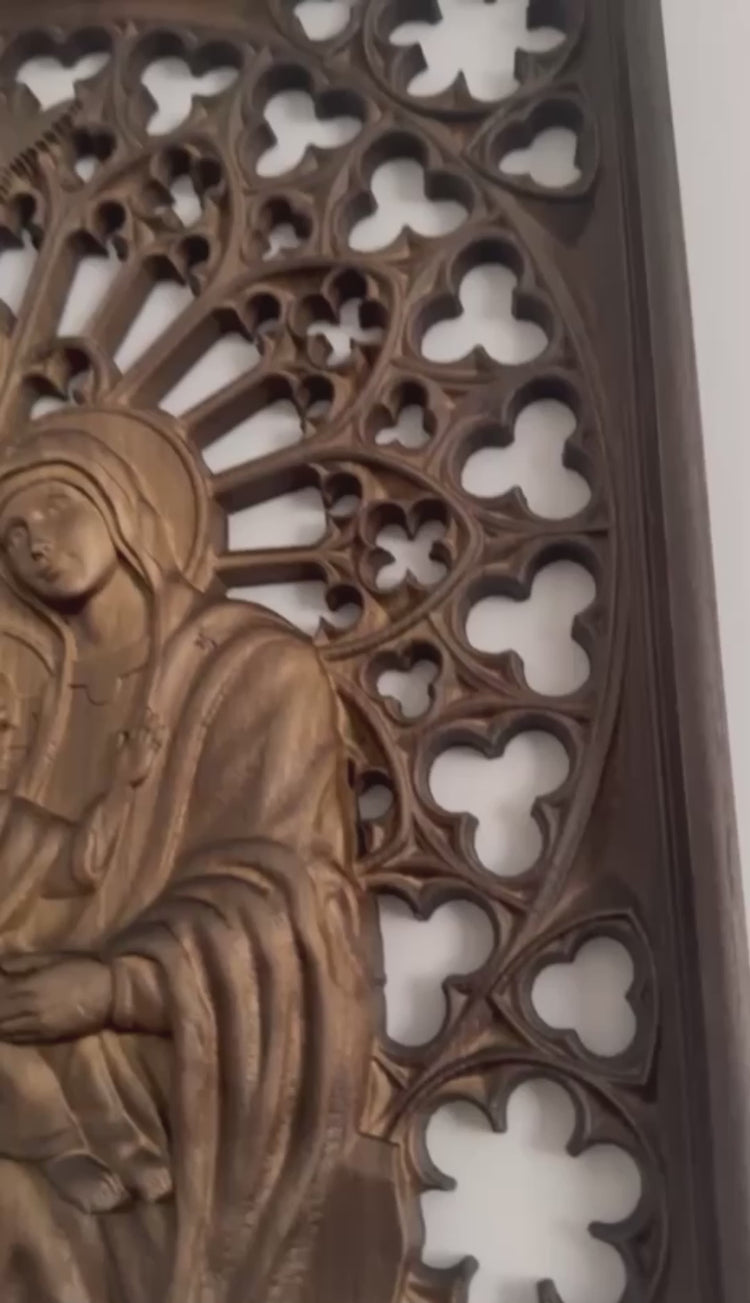 This wooden wall statue is beautifully handcrafted religious wood carving that serves as a remarkable piece of Christian home decor. This is a stunning piece of Catholic wall art that adds a touch of spirituality and elegance to your home decor. It is made in gothic design to emphasize the beauty of details on the background with your wall.