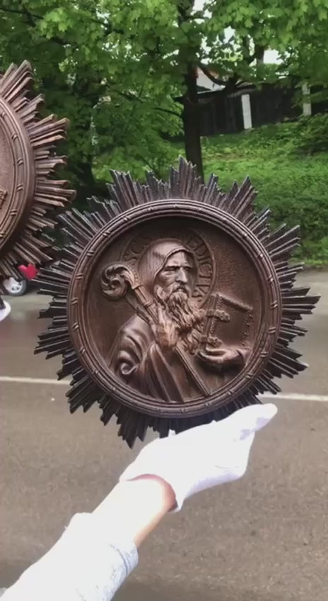 This wooden Christian sculpture of Saint Benedict is stunningly crafted from high quality natural solid oak wood. It features incredible attention to detail, with computer-processed sizing and manual tuning for the finest results. The final details are finished by hand and painted with gold color. This gorgeous sculpture makes a perfect addition to any home or office, and is a beautiful way to show your faith. Order yours today!