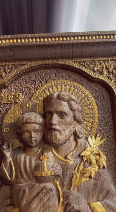 This Icon is made from the high quality natural solid Oak wood. The Icon’s finest details and its sizing involve computer processing technology with manual tuning and the final details are finished by hand with beeswax and linseed oil. Dark icons are painted with gold color by hand.