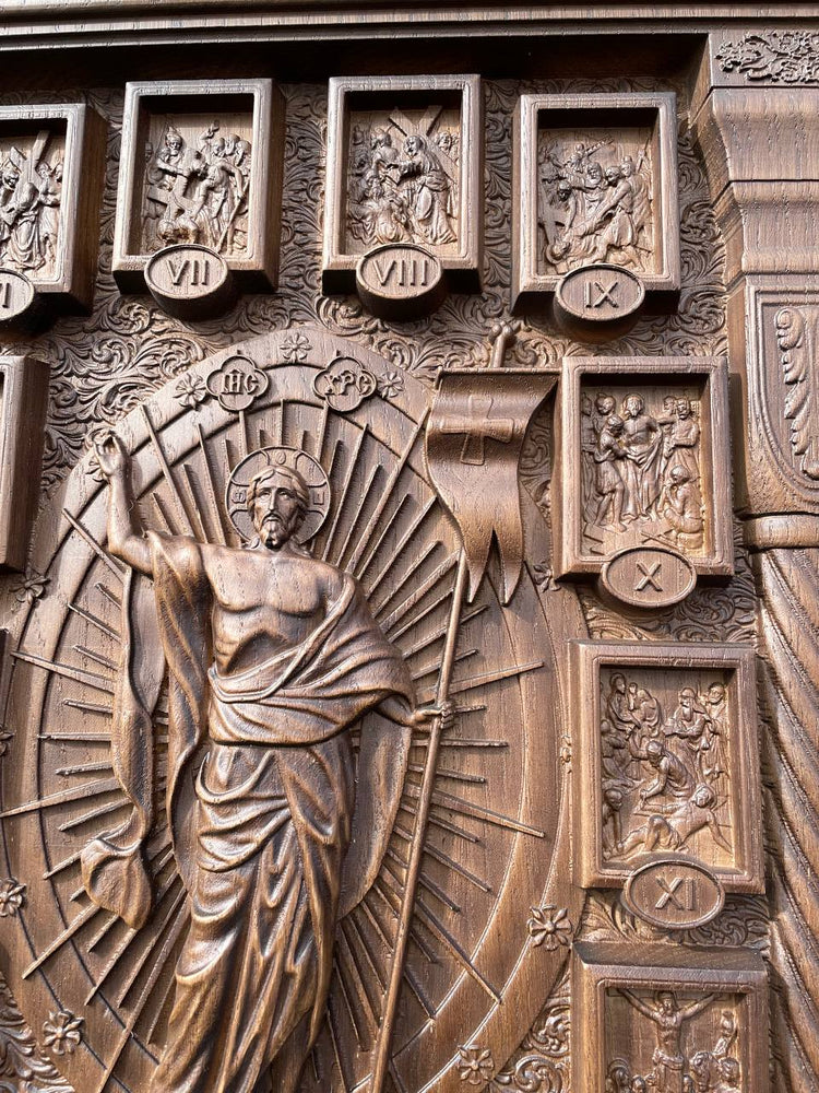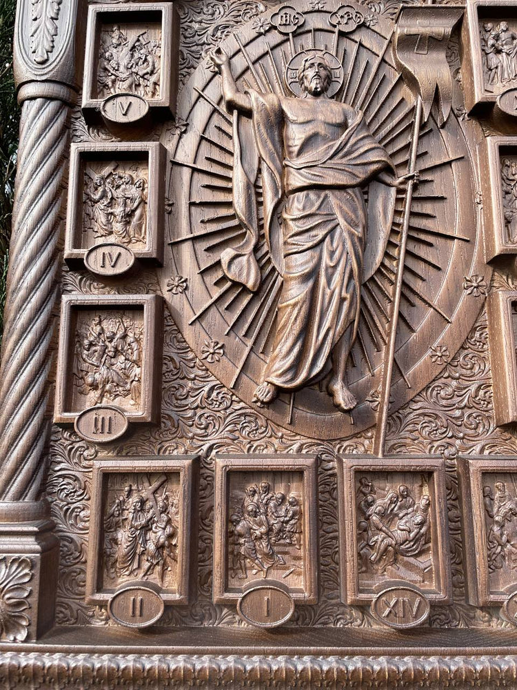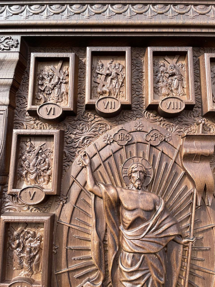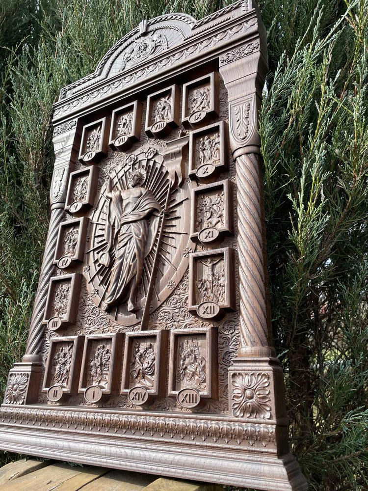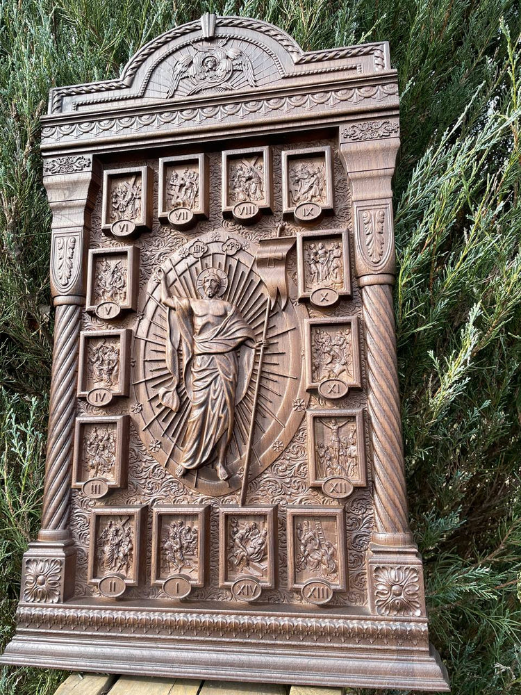 This exquisite hand-carved wooden iconostasis is a masterpiece of religious craftsmanship, featuring a central crucifix surrounded by the Stations of the Cross. Each scene is meticulously detailed, telling the story of Christ’s Passion. The elegant arched frame, ornamental carvings, and sacred symbols create a truly divine presence.