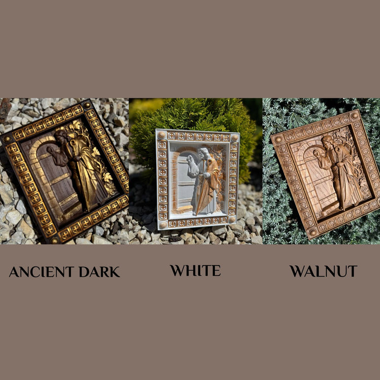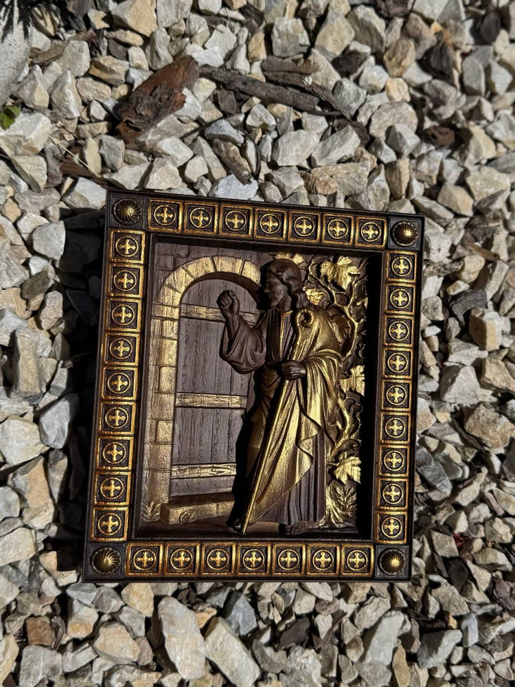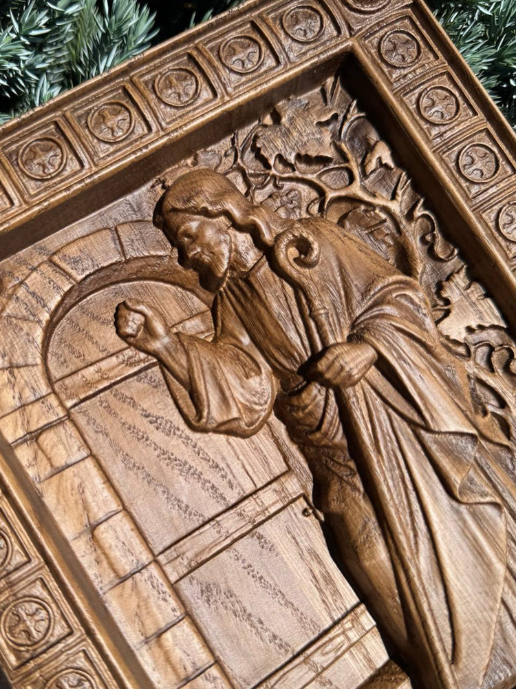 Beautifully hand-carved wooden icon of Jesus knocking at the door, inspired by Revelation 3:20. A meaningful symbol of faith, invitation, and devotion—perfect for Christian home decor, prayer rooms, or as a thoughtful spiritual gift.