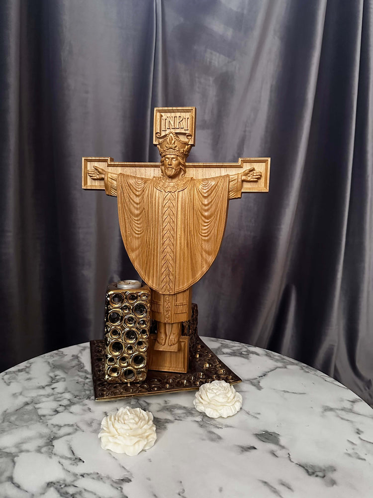 This wooden Christian sculpture of our Lord is stunningly crafted from high quality natural solid oak wood. It features incredible attention to detail, with computer-processed sizing and manual tuning for the finest results. The final details are finished by hand and painted with gold color. This gorgeous sculpture makes a perfect addition to any home or office, and is a beautiful way to show your faith. Order yours today!