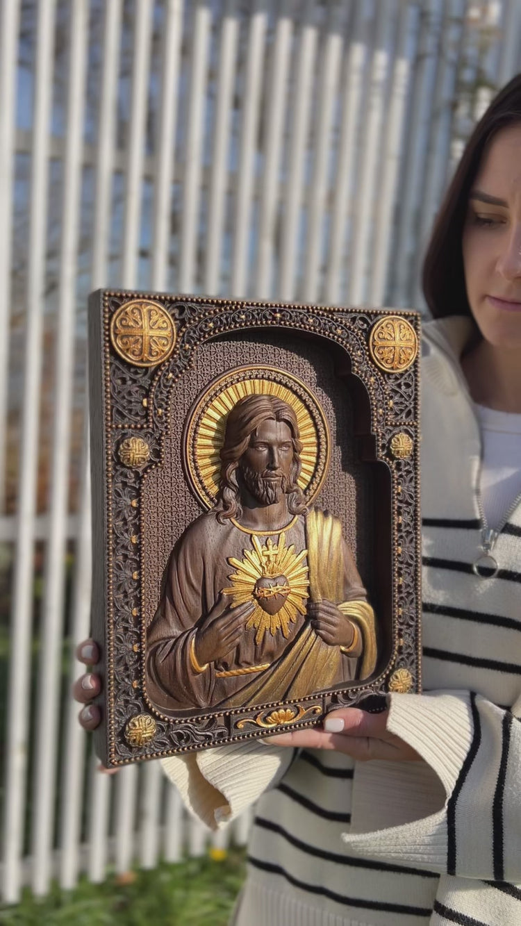 This wooden Christian sculpture of our Lord is stunningly crafted from high quality natural solid oak wood. It features incredible attention to detail, with computer-processed sizing and manual tuning for the finest results. The final details are finished by hand and painted with gold color. This gorgeous sculpture makes a perfect addition to any home or office, and is a beautiful way to show your faith. Order yours today!