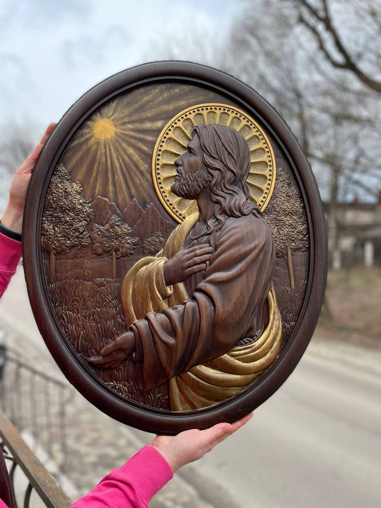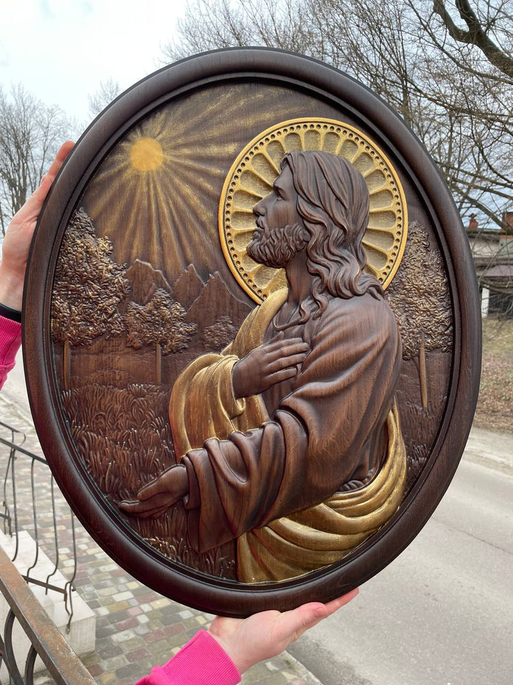 This wooden Christian sculpture of our Lord is stunningly crafted from high quality natural solid oak wood. It features incredible attention to detail, with computer-processed sizing and manual tuning for the finest results. The final details are finished by hand and painted with gold color. This gorgeous sculpture makes a perfect addition to any home or office, and is a beautiful way to show your faith. Order yours today!