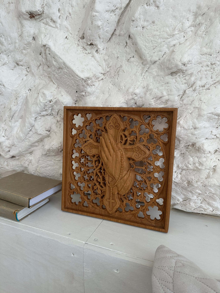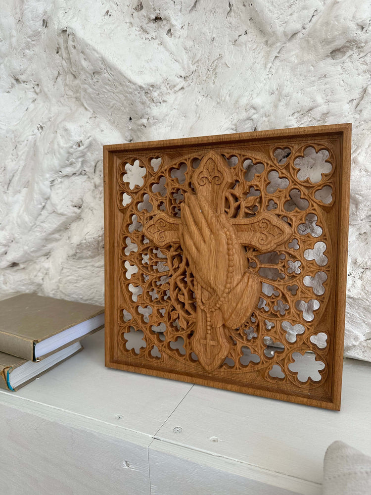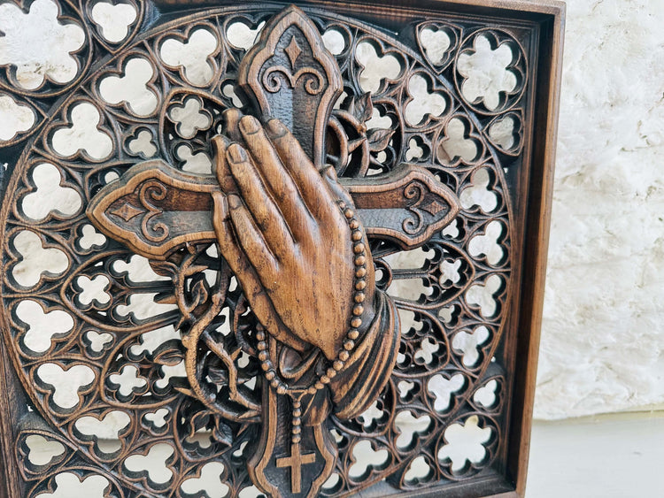 This wooden wall statue is beautifully handcrafted religious wood carving that serves as a remarkable piece of Christian home decor. This is a stunning piece of Catholic wall art that adds a touch of spirituality and elegance to your home decor. It is made in gothic design to emphasize the beauty of details on the background with your wall.