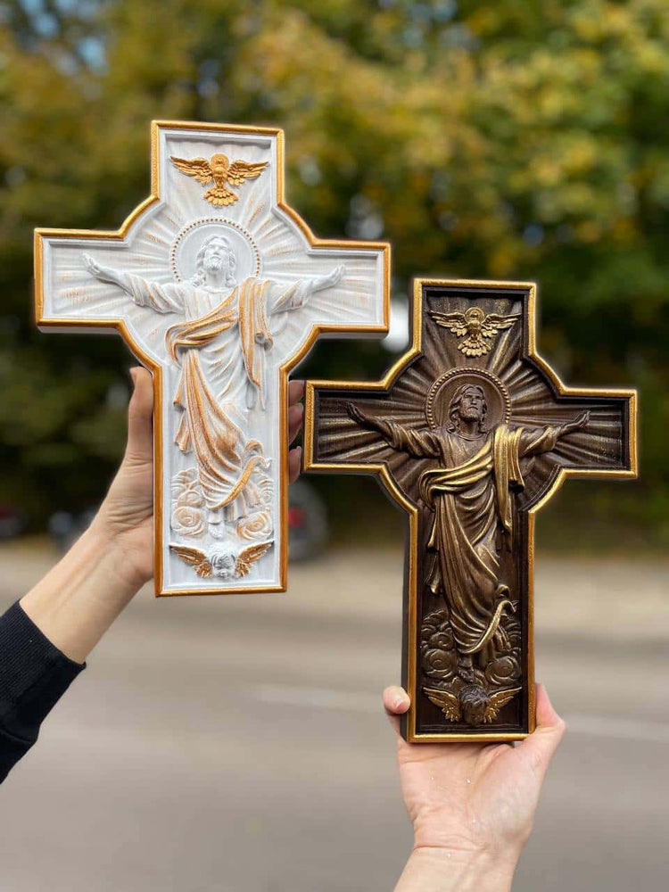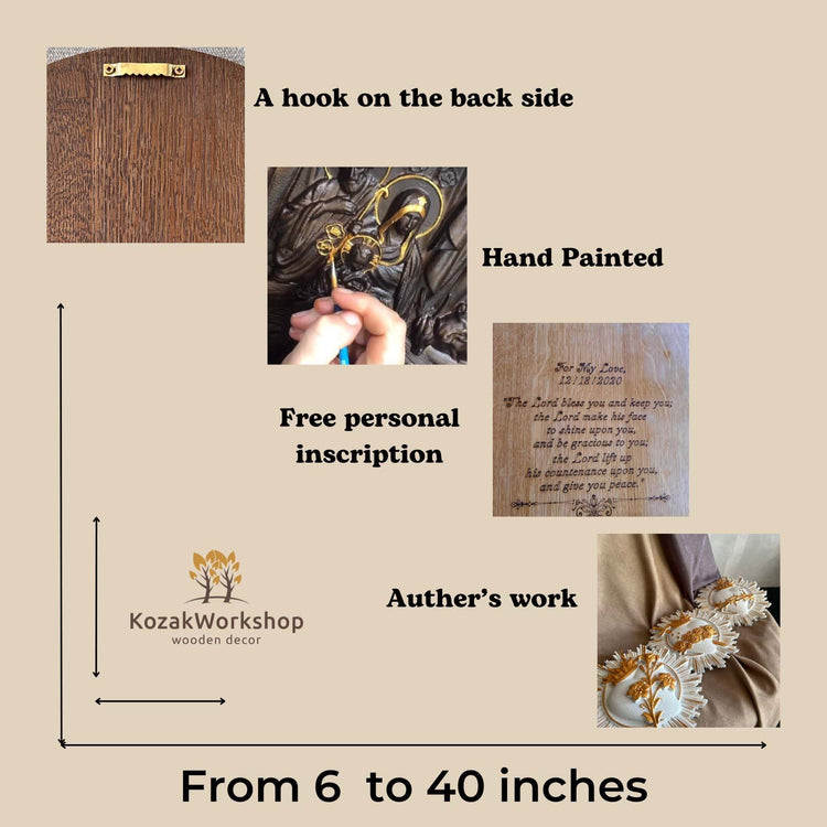 This Crucifix is made from the high quality natural solid Oak wood. Its finest details and its sizing involve computer processing technology with manual tuning and the final details are finished by hand and painted with gold color.